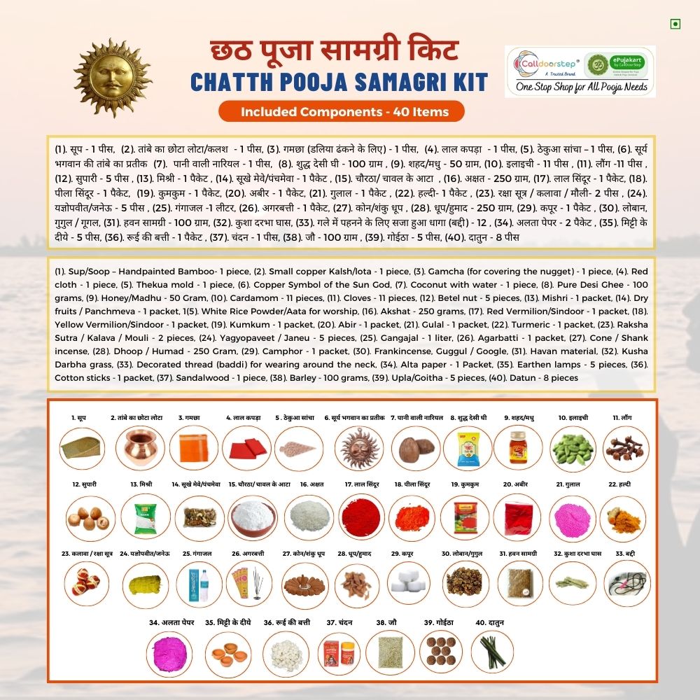 (1). Sup/Soop – Handpainted Bamboo- 1 piece, (2). Small copper Kalsh/lota - 1 piece, (3). Gamcha (for covering the nugget) - 1 piece, (4). Red cloth - 1 piece, (5). Thekua mold - 1 piece, (6). Copper Symbol of the Sun God, (7). Coconut with water - 1 piece, (8). Pure Desi Ghee - 100 grams, (9). Honey/Madhu - 50 Gram, (10). Cardamom - 11 pieces, (11). Cloves - 11 pieces, (12). Betel nut - 5 pieces, (13). Mishri - 1 packet, (14). Dry fruits / Panchmeva - 1 packet, 1(5). White Rice Powder/Aata for worship, (16). Akshat - 250 grams, (17). Red Vermilion/Sindoor - 1 packet, (18). Yellow Vermilion/Sindoor - 1 packet, (19). Kumkum - 1 packet, (20). Abir - 1 packet, (21). Gulal - 1 packet, (22). Turmeric - 1 packet, (23). Raksha Sutra / Kalava / Mouli - 2 pieces, (24). Yagyopaveet / Janeu - 5 pieces, (25). Gangajal - 1 liter, (26). Agarbatti - 1 packet, (27). Cone / Shank incense, (28). Dhoop / Humad - 250 Gram, (29). Camphor - 1 packet, (30). Frankincense, Guggul / Google, (31). Havan material, (32). Kusha Darbha grass, (33). Decorated thread (baddi) for wearing around the neck, (34). Alta paper - 1 Packet, (35). Earthen lamps - 5 pieces, (36). Cotton sticks - 1 packet, (37). Sandalwood - 1 piece, (38). Barley - 100 grams, (39). Upla/Goitha - 5 pieces, (40). Datun - 8 pieces